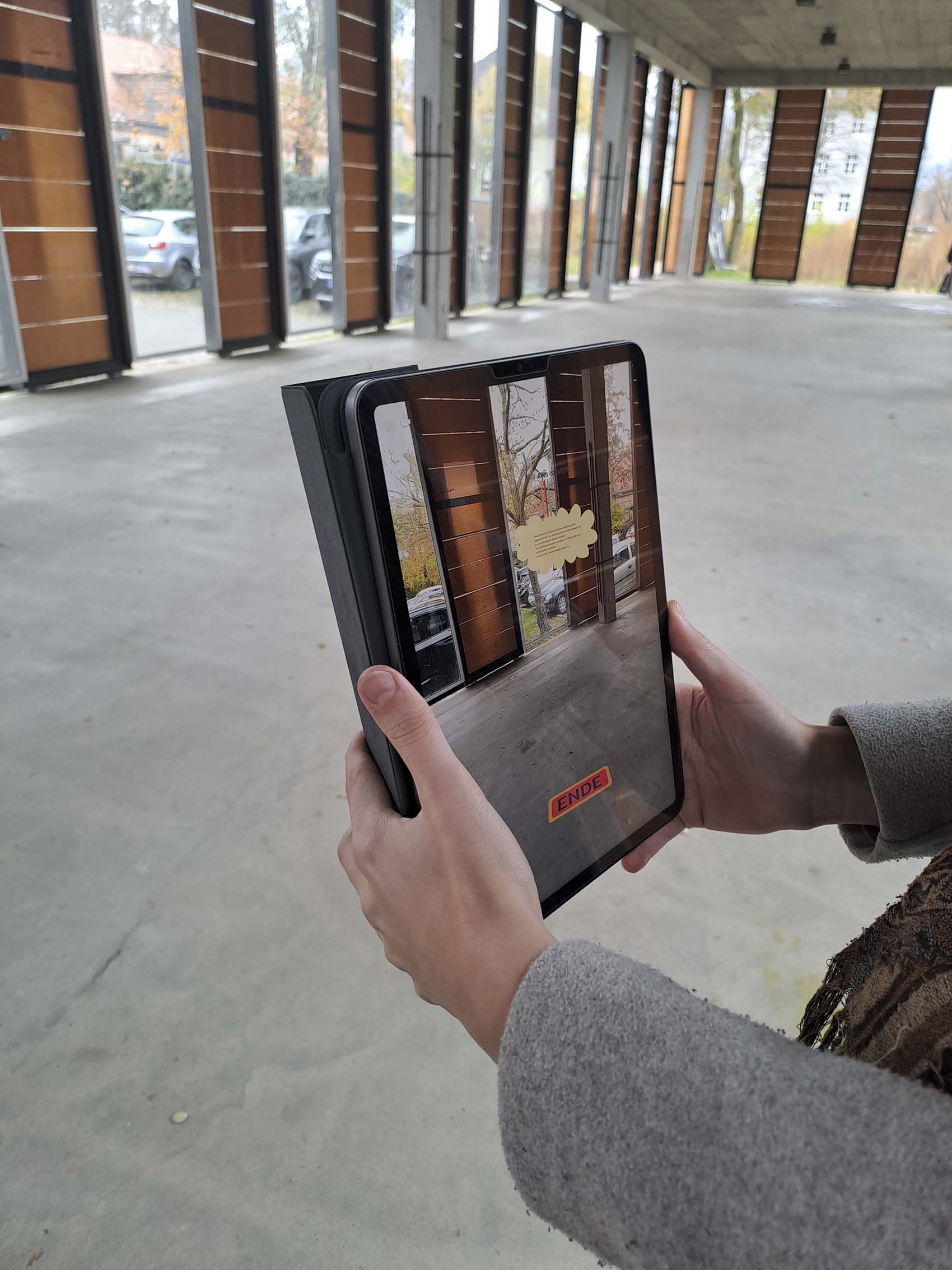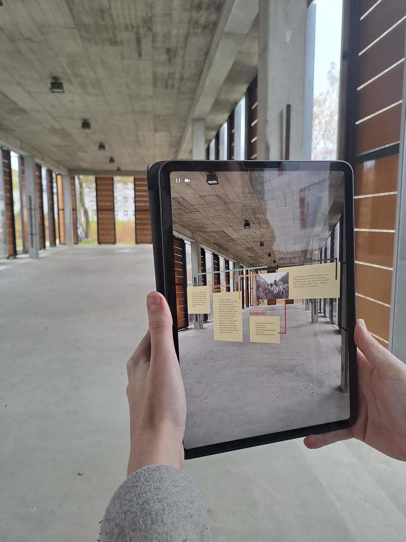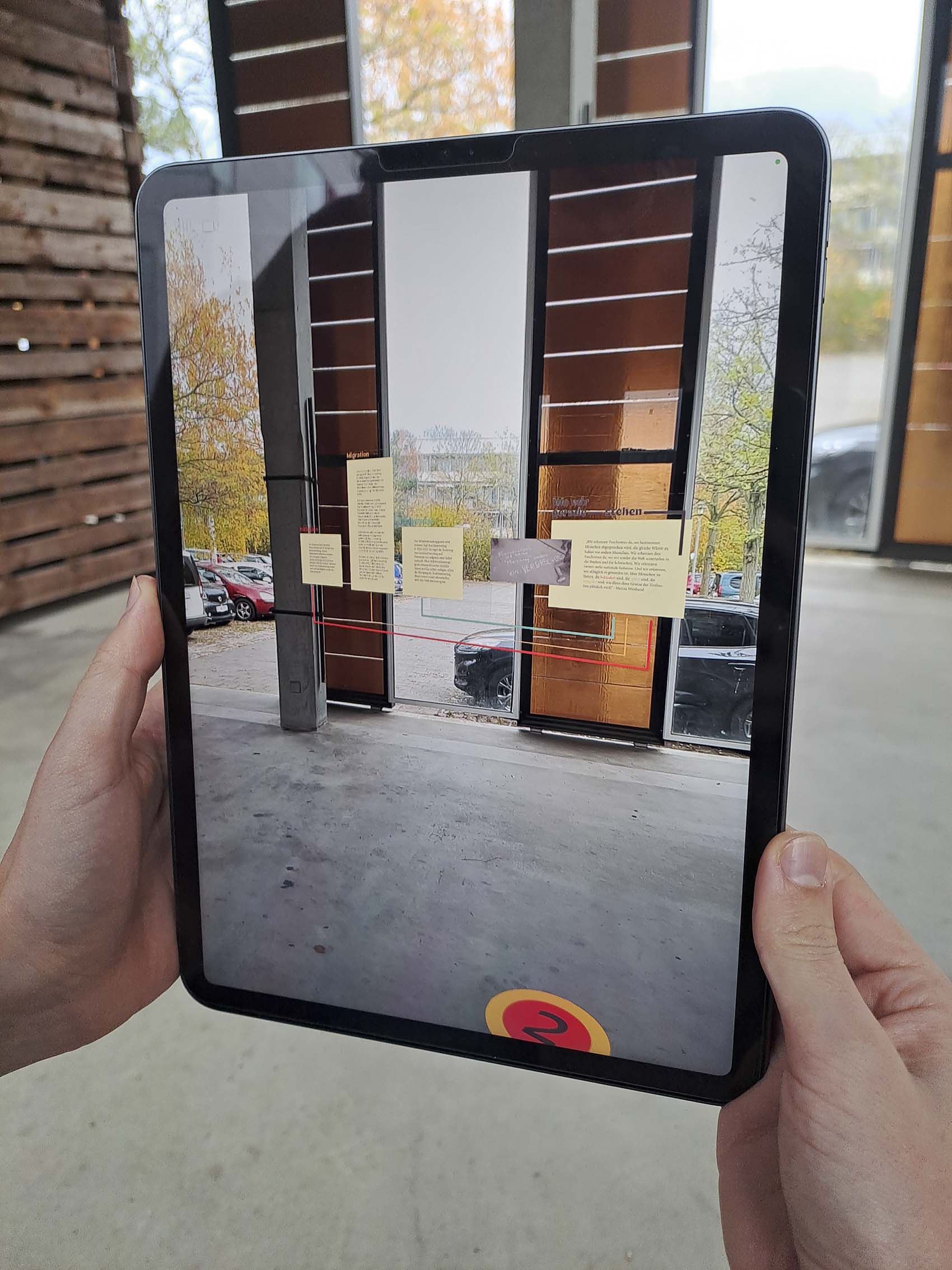 Augmented Reality legt eine digitale Oberfläche über die reale Welt, also projeziert Objekte in physisch vorhandene Räume. Die Ausstellung ist mit Scenery entanden.