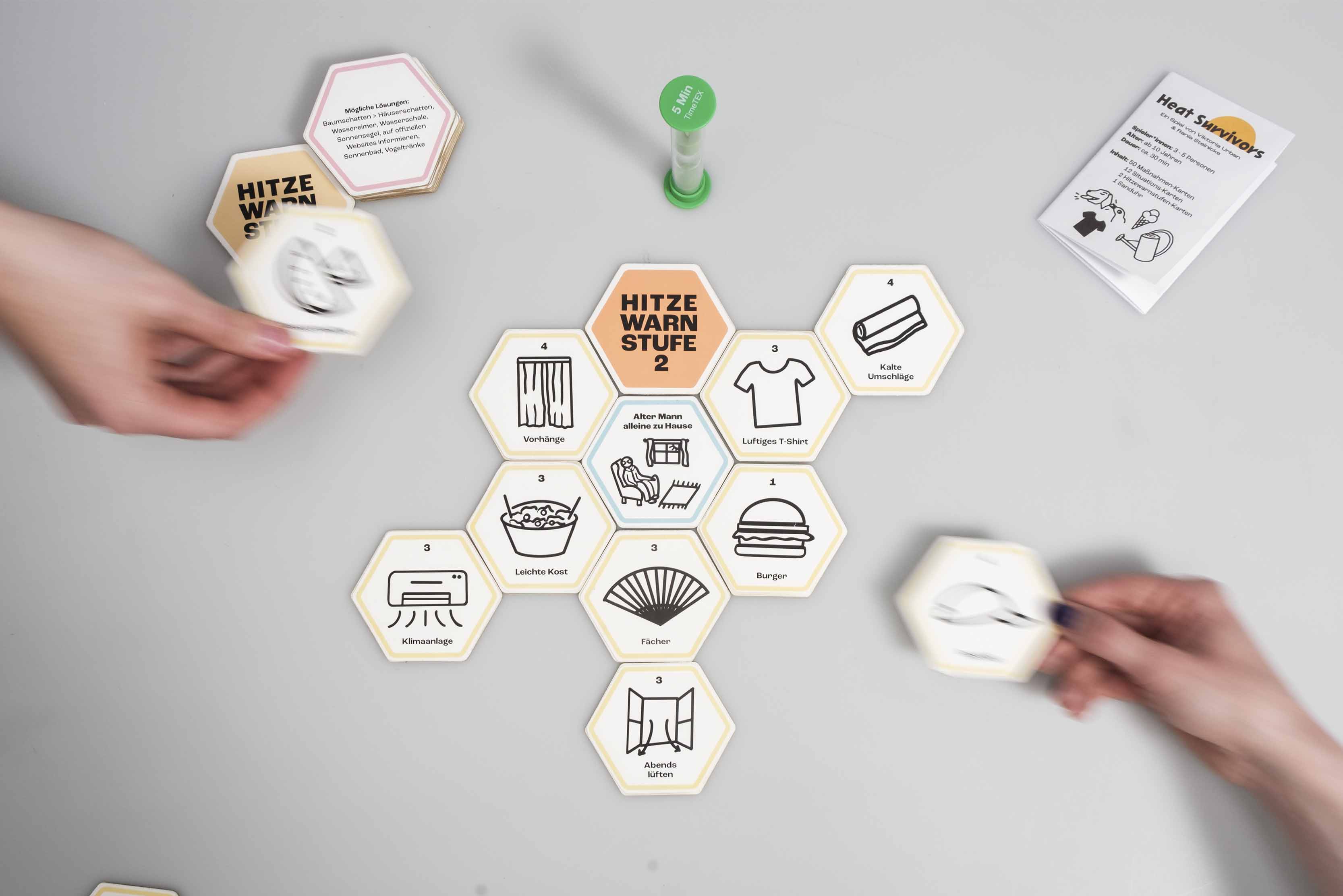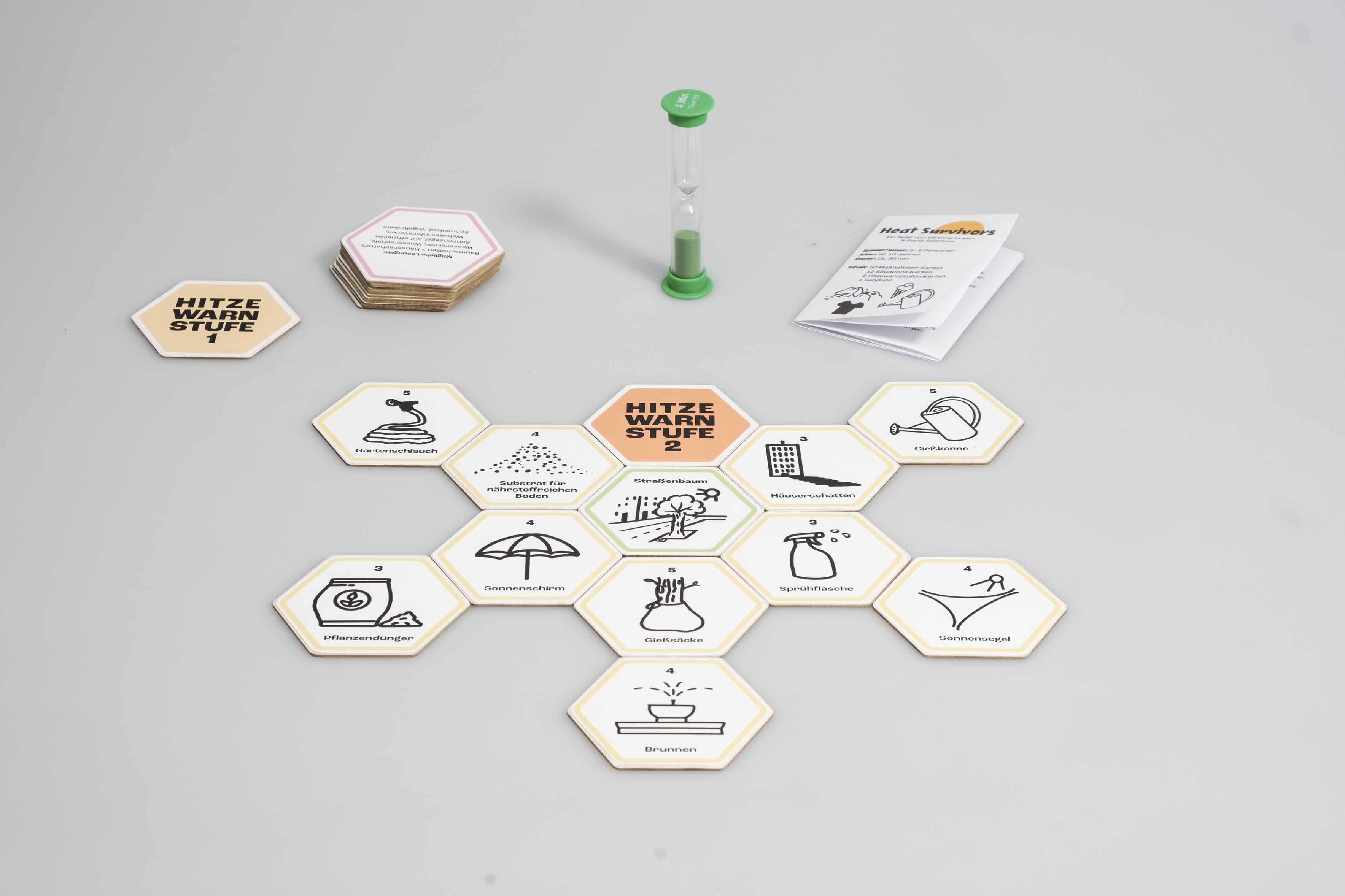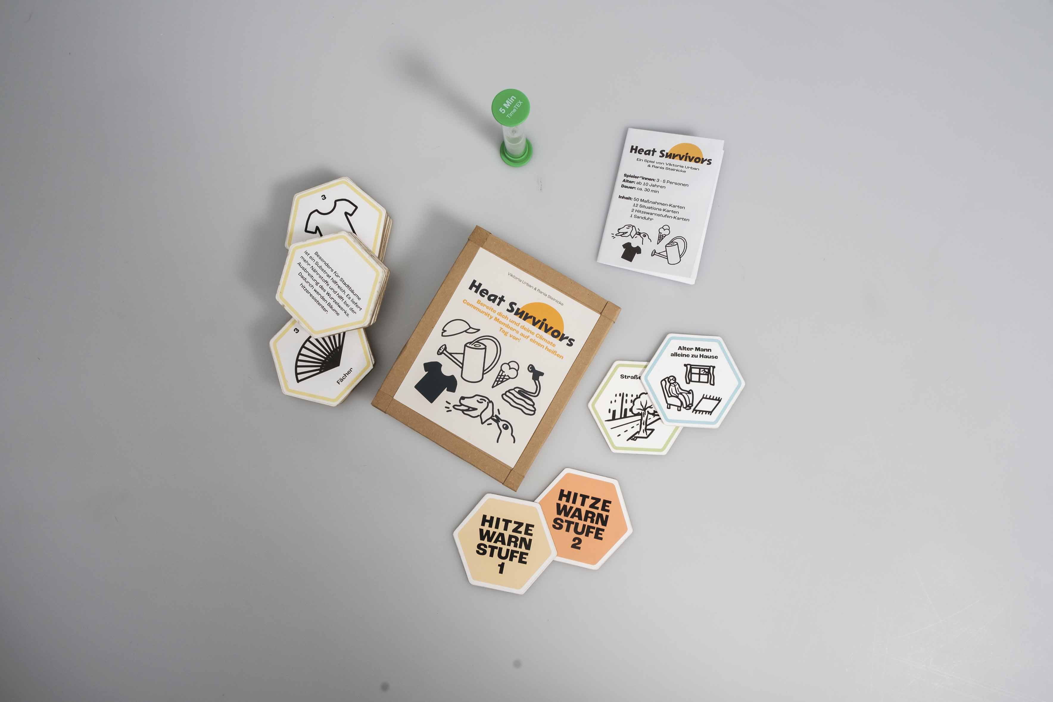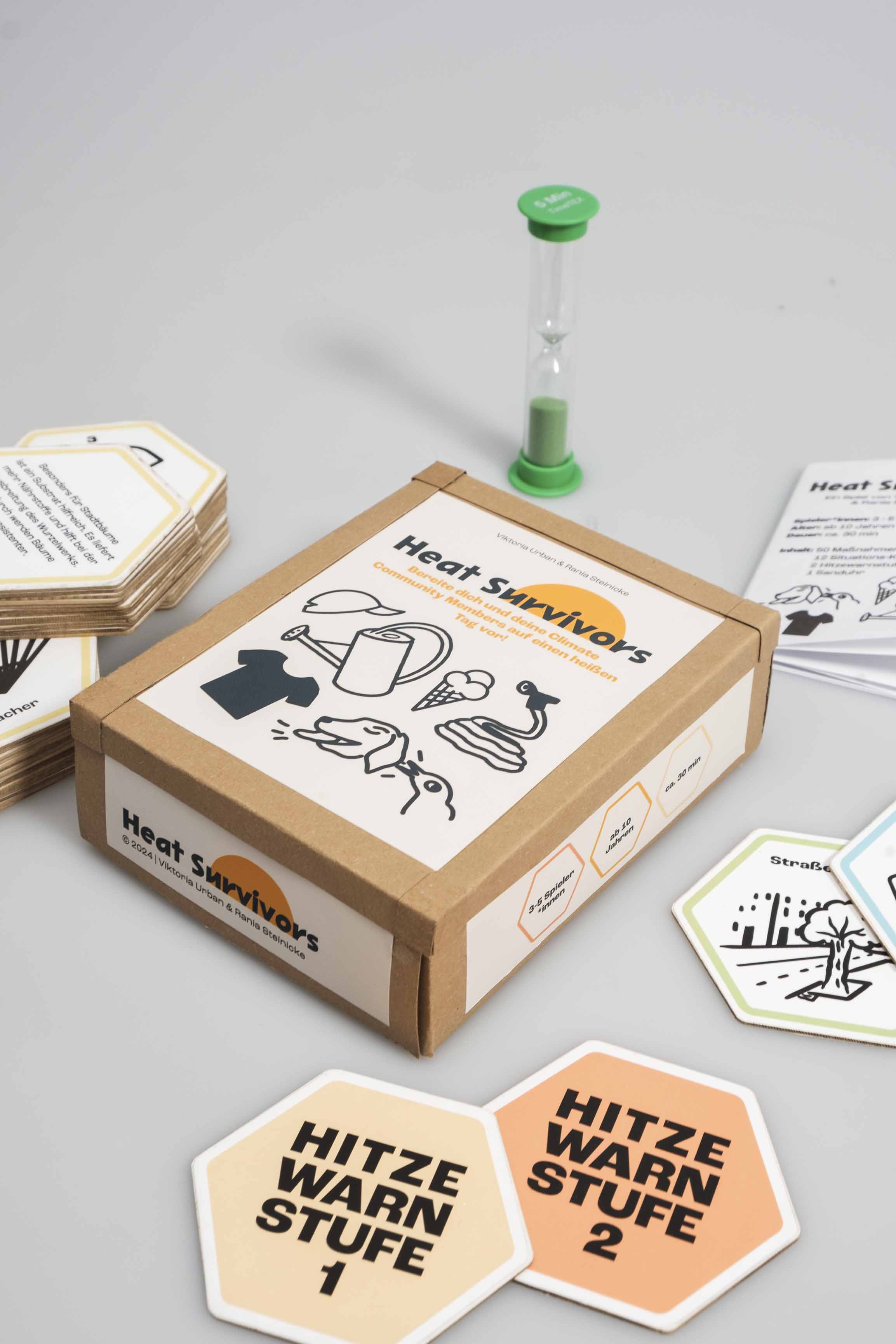 Das Spiel „Heat Survivors“ hat den Anspruch als Gesellschaftsspiel Menschen in den Austausch darüber kommen zu lassen, welche Maßnahmen in dicht besiedelten Räumen während Hitzewellen sinnvoll sind. Das Projekt ist zu zweit in Teamarbeit entstanden und ist eine Kooperation mit dem Bezirksamt Treptow-Köpenick in Berlin.