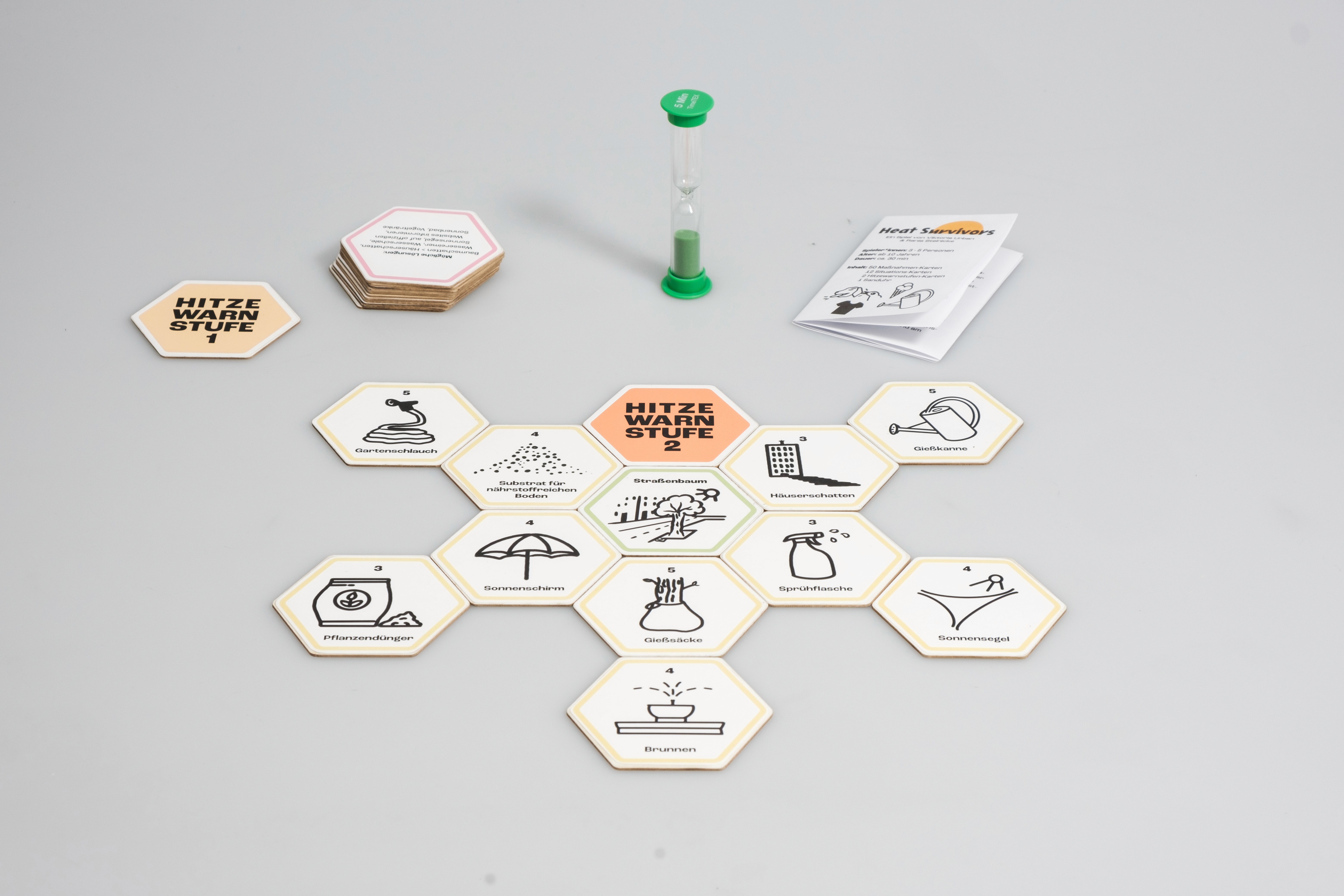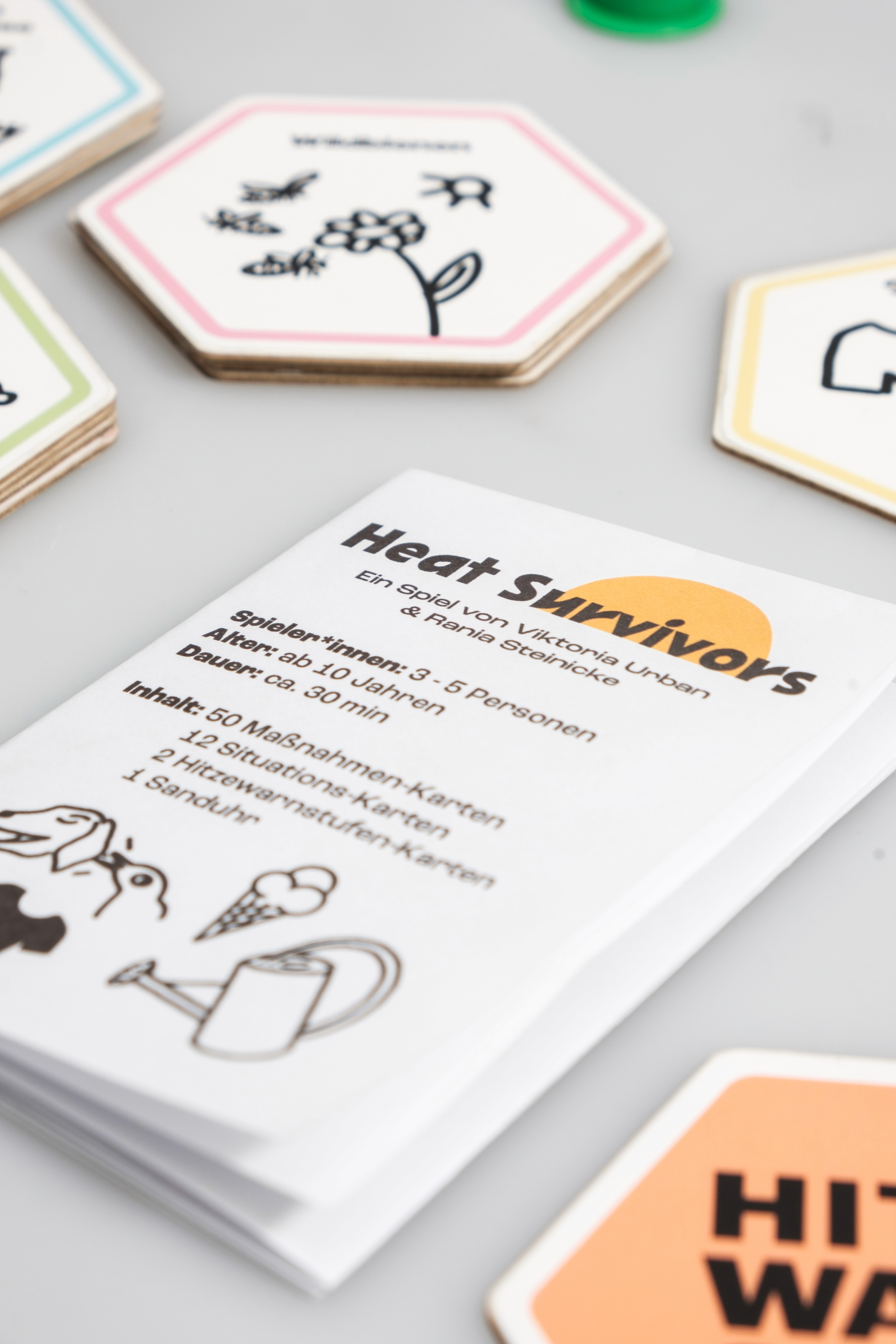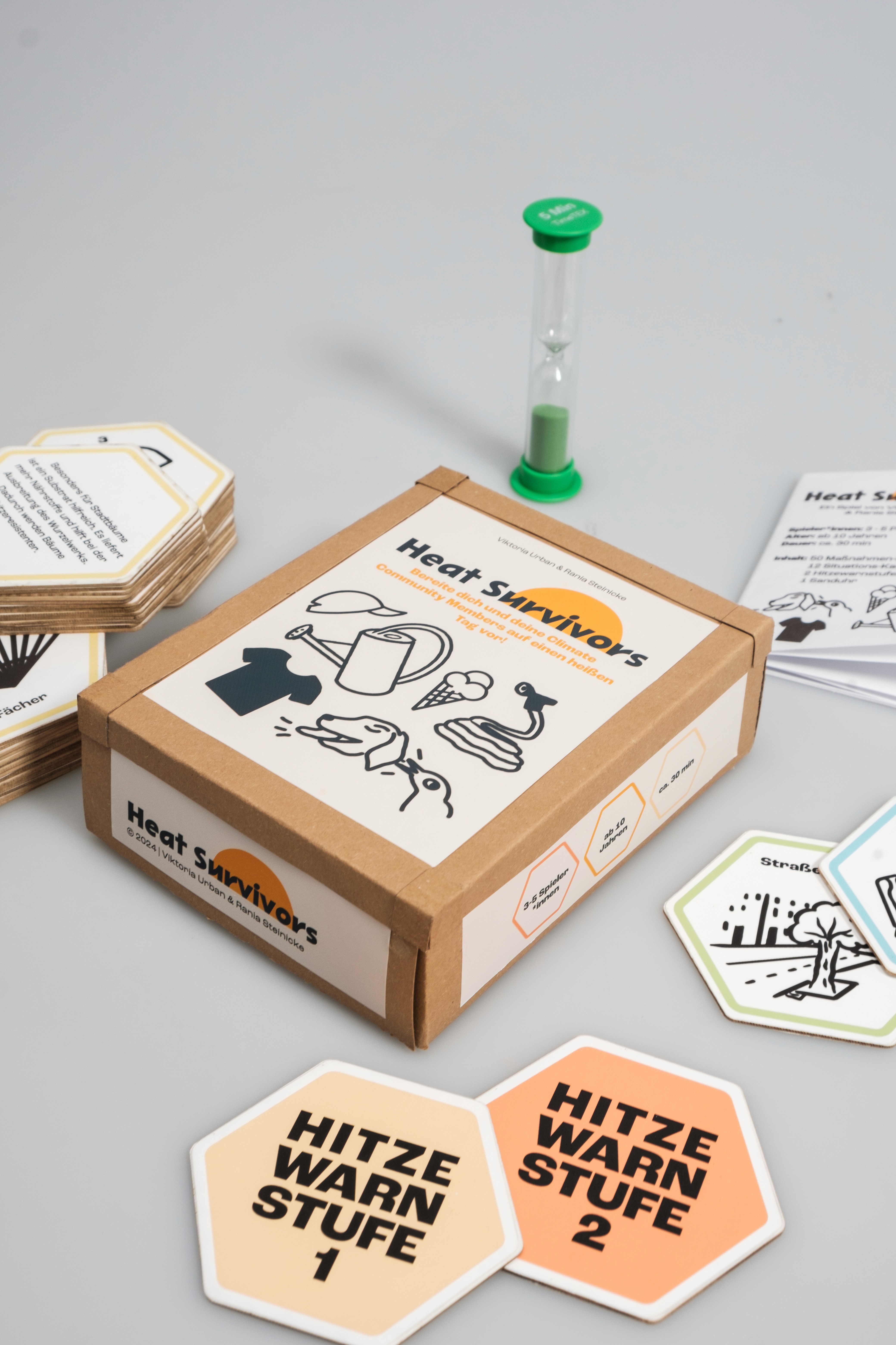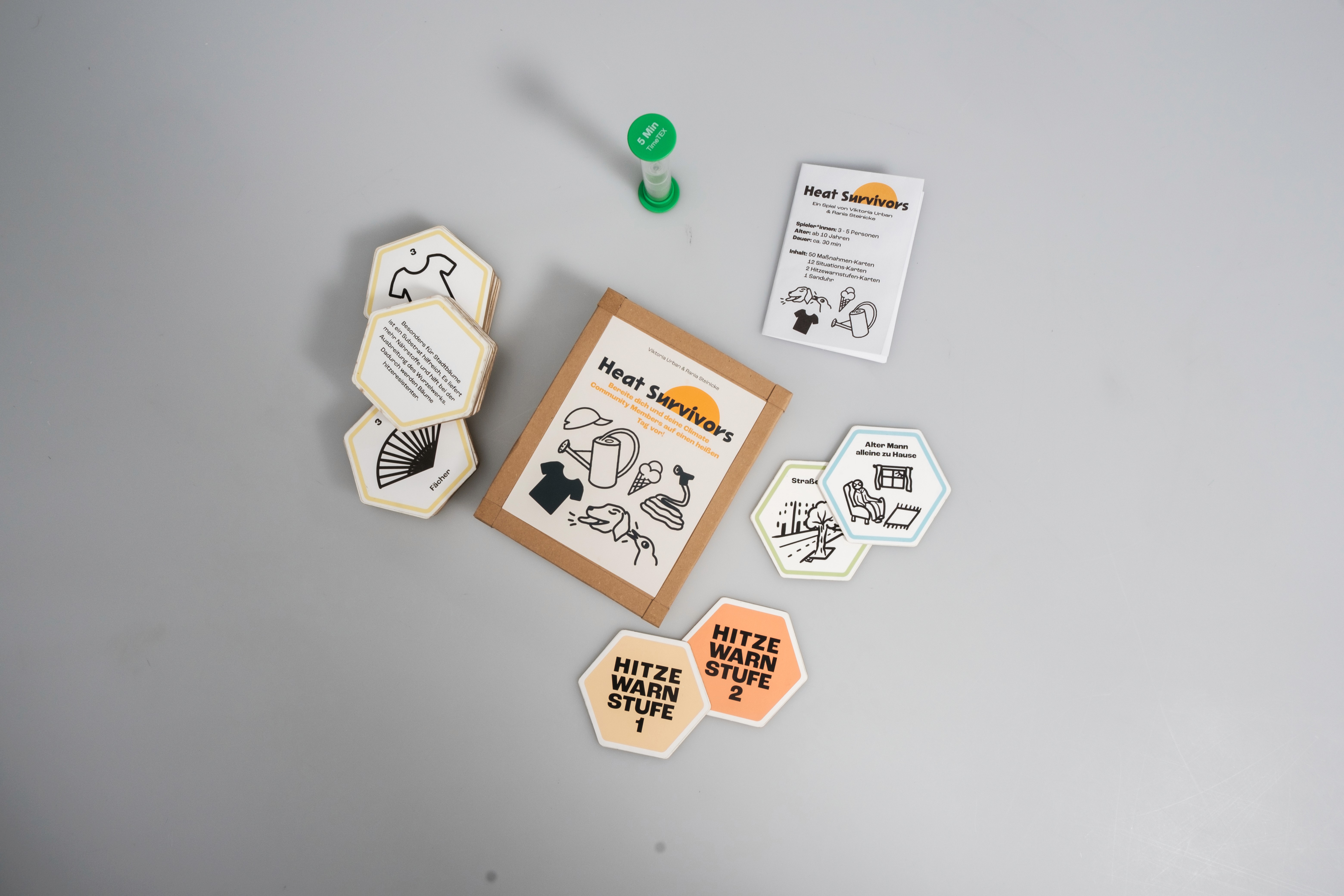 Das Spiel „Heat Survivors“ hat den Anspruch als Gesellschaftsspiel Menschen in den Austausch darüber kommen zu lassen, welche Maßnahmen in dicht besiedelten Räumen während Hitzewellen sinnvoll sind. Das Projekt ist zu zweit in Teamarbeit entstanden und ist eine Kooperation mit dem Bezirksamt Treptow-Köpenick in Berlin.