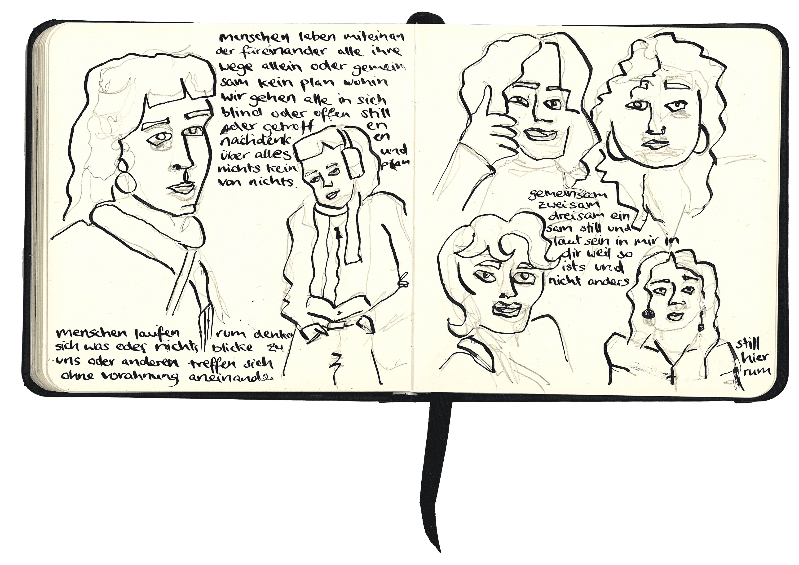 In meinen Skizzen- und Notizbüchern vereine ich freie Zeichnungen ganz ohne viel Nachdenken mit Textfragmenten, die gemeinsam ein Bild meiner Beobachtungen und Stimmungen ergeben.
